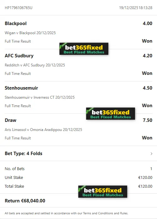 If you’re looking for more favorable odds than our free matches provide and want to secure immediate profit, our Combo VIP Fixed Matches tickets are the perfect solution. Our knowledgeable betting experts craft these tickets to ensure your success. You can purchase next weekend’s VIP Fixed Matches tickets here! We guarantee your profit and success with our 100% reliable fixed games. Contact us now to buy your next fixed matches!